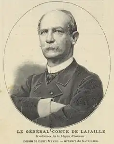 During the Franco-Prussian War (1870) La Jaille commanded the reserve artillery of Marshal Edmond Le Bœuf's 3rd army corps.[7] He served during the Siege of Metz, which capitulated on 27 October 1870, and was then held as a prisoner in Bonn.[3] In 1871 he commanded the reserve artillery of the Versailles army during the suppression of the Paris Commune.[7] He was promoted to brigadier general on 24 June 1871.[10] He was stationed at Bourges and commanded the 5th infantry brigade of the 8th army corps.[4] He was given three stars (divisional general) on 15 March 1877.[3] He was appointed a member of the artillery committee in 1877 and was president of the artillery committee in 1882.[4][3] He was appointed Grand Officer of the Legion of Honour in 1882. He had served for 41 years in 11 campaigns with one injury and three citations.[10]