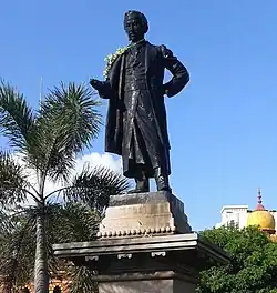 De Soysa introduced a system of free education and scholarships in the schools he founded in his home-town; the Prince & Princes of Wales Colleges. A statue sculptured by Tissa Gunawardena was unveiled during the early 1980s at the College premises in Moratuwa.[60] De Soysa lavished the then princely sum of Rs. 300,000 on the buildings alone, on a beautiful site of 15 acres bordering the Lunawa lagoon.[61][62] The secular school catered to both genders of all walks of life as the mediums of instruction were English, the language of the elite as well as the vernacular (Sinhala), the native language of the masses. Two plantations were also endowed for its maintenance. The ceremonial opening was performed by Sir William Gregory, the Governor of Ceylon, on 14 September 1876 (along with the ceremonial opening of the St. John's Church and St. John's College Panadura built by Mudliyar Susew De Soysa).[63][64][65][66] Princess of Wales' College [67] was the first major attempt at imparting a secular education for girls in the country.[8]