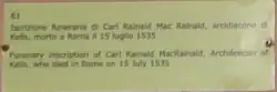 "Charles Raynal McRaynal, son of Maurus Raynal, born of a renowned family in Ireland; well adorned with the gifts of body and mind (and) very skilled in both laws. Archdeacon of Kells of the Diocese of Meath; Counsellor of his illustrious friend Thomas of Kildare; Messenger sent by his superior to Paul III Supreme Pontiff about serious matters especially those pertaining to the Christian Redemption. While he carried out these things in Rome with the greatest faith and integrity. on the day before he was set over the churches Elphin and Clonmaicnois, on account of his merits by the same Paul, Supreme Pontiff. he was suddenly carried off by an incurable fever to the greatest grief of all. He was buried on the Ides of July in the year of Our Lord 1535, in the 38th year of his age.".[27]