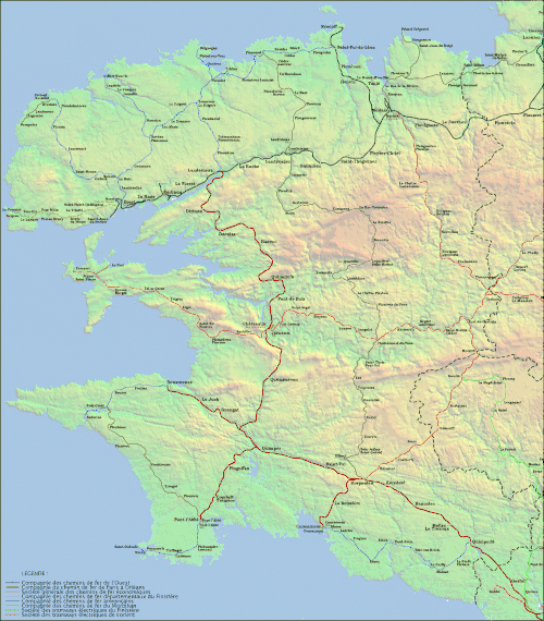 The CFDF was a voie ferrée d'intérêt local. The main line ran from Brest to St. Pol-de-Léon with branches to Porspoder, L'Aber-Wrach, Brignognan and Quimperlé. The CFDF absorbed the Chemins de Fer Armoricains (CFA) in 1921[1] and the Tramways Électrique du Finistère in 1922.[2] The railway was operated by the Compagnie des chemins de fer départementaux du Finistère until 1936, then by the Régie départementale des chemins de fer et autobus du Finistère until 28 February 1939 and finally by the Société générale de chemins de fer économique from 1941 to 1946. Service was suspended between 1939 and 1941.[3]