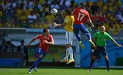 Chile (red and blue) playing against tournament hosts Brazil (yellow and white), in the 2014 FIFA World Cup Round of 16.