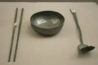 Chinese ancestors successfully planted millet, rice, and other grains about 8,000 to 9,000 years ago.[39] Wheat, another staple, took another three or four thousand years. For the first time, grains provided people with a steady supply of food. Because of the lack of various foods, Chinese people had to adapt to new eating habits. Meat was scarce, and so people cooked with small amounts of meat and rice or noodles.[40]