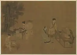 The tea culture flourished during the Song dynasty, where it was consumed by the elite during social gatherings where Chinese arts and poetry were appreciated and discussed.[2][18] Detailed standards also emerged for judging the color, aroma, and taste of tea.[19] Tea art, the tea gatherings, and tea houses continued to increase in popularity. Knowledge of proper tea making was considered a gentlemanly pursuit, along with other skills like calligraphy, painting, and poetry.[9]