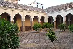 Prior to the current church, the site was occupied by the Great Mosque of the Albaicin (Arabic: مسجد الجامع البيازين, romanized: Masjid al-Jāmi' al-Bayyāzīn).[4] The mosque was built in the 13th century under Almohad rule.[5][4] Only its courtyard (sahn), with arcades of horseshoe arches, has been preserved today as part of the church. The mosque originally covered a total area measuring 42.4 by 32.2 metres.[6] Its prayer hall, now disappeared, had a hypostyle form similar to the city's larger Great Mosque on the site of the current Cathedral. It had 9 aisles divided by rows of arches supported by 86 marble columns, with the central aisle being wider than the others. The courtyard was planted with lemon trees. Across the street from the mosque, there originally stood an Islamic primary school and a khan (urban caravanserai).[6]