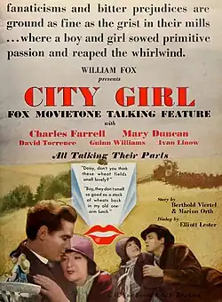 City Girl is a 1930 American part-talkie sound drama film directed by F. W. Murnau, and starring Charles Farrell and Mary Duncan. It follows a waitress in Chicago who falls in love with a farmer in Minnesota and leaves her life in the city to be with him. It is based upon the play "The Mud Turtle" by Elliot Lester. Though shot as a silent feature, the film was refitted with some sound elements and released in 1930 as a sound film due to the public apathy to silent films. While the film has a few talking sequences, the majority of the film featured a synchronized musical score with sound effects using both the sound-on-disc and sound-on-film process.[3][2]