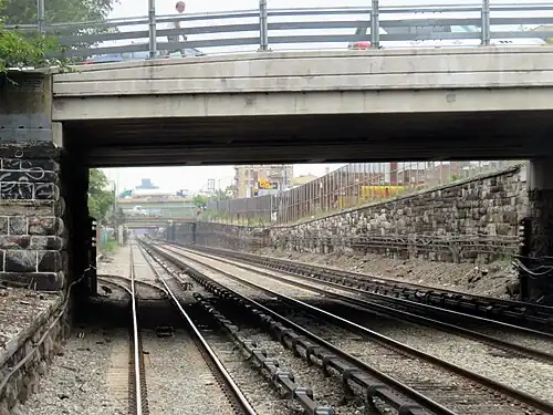 The station was renamed for that park roughly around the time Claremont Park station was rebuilt by New York Central in April 1891, as part of a grade elimination project within the Bronx.[4] It contained a station house as a bridge on the north side of Claremont Parkway over all four tracks, with two side platforms. Similar structures were built for the former Morrisania Station, as well as the still operating Melrose and Tremont Stations.[5][6] A small freight yard also used to exist north of the station between the Claremont Parkway and 173rd Street bridges, the remnants of which can still be seen to this day. Three blocks east, the Suburban Rapid Transit Company built the Third Avenue Elevated Line and installed a station along the same street in 1888.[7] No streetcar or bus lines connected the two stations to one another, however.