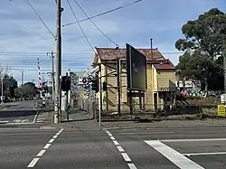 Clifton Hill is listed on the Register of the National Estate[9] as an intact example of a Victorian Tudor-style suburban railway station, and is one of eleven that were originally built between 1887 and 1889. It is the only example that still retains the original corrugated iron wings on either side of the main building. The timber verandah on the eastern platform (Platform 1) is also considered architecturally rare. Other features of the complex include two timber-framed gabled roofed signal boxes (built in 1888 and 1901 respectively), located on either side of Platform 2, and the original swinging railway gates (out of use since 1992).[10] One signal box was for the operation of the former level crossing gates across Heidelberg Road, which was replaced by a road overpass in 1957. The other signal box controlled the level crossing gates at Ramsden Street.