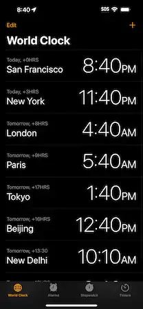 The World Clock allows users to access the current time of different cities of their choosing from around the world.[5] More locations can be added by tapping the plus icon at the top of the screen, or removed by swiping left on a location and clicking the delete button.[8] On all versions except iOS, the world clock will also display the sunrise and sunset time for each location, as well as a map which displays where it is currently night and day.