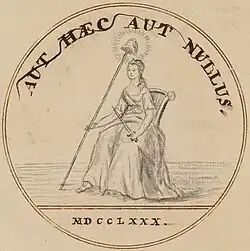 Barton then came up with another design, which the committee submitted back to Congress on May 9, 1782, just five days after being formed. This time, the figures on each side of the shield were the "Genius of the American Confederated Republic" represented by a maiden, and on the other side an American warrior. At the top is an eagle and on the pillar in the shield is a "Phoenix in Flames". The mottos were In Vindiciam Libertatis (In Defense of Liberty) and Virtus sola invicta (Only virtue unconquered).[54]