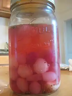 A cocktail onion is usually a pearl onion pickled in a brine with small amounts of turmeric and paprika.[1] Pearl onions are usually chosen for their natural sweetness, but other sweet onions such as the crystal wax, also known as the white Bermuda, are also sometimes used. In many cases, white varieties of these sweet onions are used, since many consumers expect cocktail onions to be white. However, yellow or red sweet onions may be used as well. In northern California cuisine some haute bars may use sliced red onion pickled in vinegar. Some recipes also call for the onions to be packed in white vermouth instead.[1]