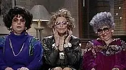Near the end of the sketch, the women compared Streisand to "buttah" – and suddenly, a voice announced, "All this talk about food, I'm getting hungry, girls." It was Streisand herself in a surprise appearance; none of the actors had any idea that she was to appear. All three managed to remain in character as the audience went wild. (Myers as Richman screamed, "I can die now! That's all the time we have for this week; I have to go and die now!") The real Richman, sitting in the audience that night to watch her then son-in-law lampoon her, has acknowledged having been "tickled to death" at that particular moment, as Streisand is one of her actual heroes as well.
