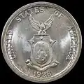 2. ^ The transition from protectorate to commonwealth, which occurred November 15, 1935, was commemorated on a set of three coins dated 1936-M. The fifty-centavo piece shows facing portraits of outgoing Governor-General Frank Murphy and incoming President Manuel Quezon. They are portrayed again on one of the peso coins, this time in profile, their busts overlapping. This same configuration is used for the other one-peso commemorative, but on its obverse the subjects are President Quezon and President of the United States Franklin D. Roosevelt. This is a very rare instance of a living U. S. president appearing on a United States coin. The common reverse for all three coins depicted the arms of the Commonwealth of the Philippines. Featuring elements symbolic of Spain, The USA and the islands themselves, it was adopted as the common reverse for all regular-issue coins beginning in 1937.