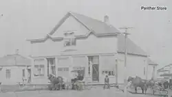 About 1934 John and Mart Sheaffer bought up all of the Co-operative Association and became full owners of Panther Store. Rooms above the store served as living quarters for the manager. The store became a popular place for farmers to congregate. On Saturday afternoons and on rainy days, the hitching racks filled up with teams as folks came for supplies. They bought groceries, dry goods, shoes, tobacco, kerosene, men's overalls and shirts, mittens, canned goods, shucking pegs, ammunition, and candy. Panther served as a produce store, buying poultry, eggs, cream, and butter. They took orders for buggy, wagons, a variety of farm machinery, fencing materials, and furniture. These orders were shipped to Dallas Center and then hauled out by teams. When cars and trucks came more into use, they were used, instead of horse-drawn wagons to bring supplies from Des Moines. Motorized travel made it necessary to install a gasoline pump.[3]