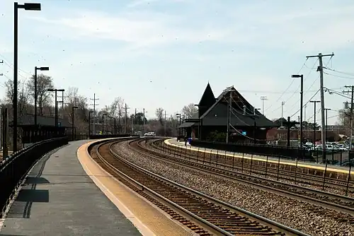 College Avenue is one of two stations on Metra's Union Pacific West Line located in Wheaton, Illinois. The station is located at 303 North President Street, and lies next to Wheaton College. The station is located 23.8 miles (38.3 km) away from Ogilvie Transportation Center, the eastern terminus of the West Line.[2] In Metra's zone-based fare system, College Avenue is in zone 4. As of 2018, College Avenue is the 47th busiest of the 236 non-downtown stations in the Metra system, with an average of 1,059 weekday boardings.[1] Unless otherwise announced, inbound trains use the north platform and outbound trains use the south platform.