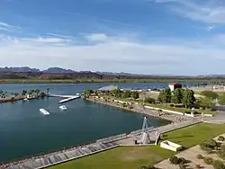 View of the Colorado River and the marina and riverside facilities of the Bluewater Resort and Casino