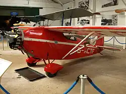 The Comper Swift was a compact single-seat monoplane aircraft with a high-mounted wing.[1] It was designed as an affordable and low-powered aircraft, albeit one that could deliver performance equal to that of contemporary twin-seat light aircraft. The Swift had a relatively slim appearance with various clean and aesthetically pleasing lines, the fuselage being heavily streamlined, except for the cockpit and a fairly restrictive width adhered to.[4] Despite this, a relatively comfortable cockpit was provisioned along with clear and well-positioned instrumentation, much of it being installed on a dedicated dash.[5] Of particular note was the engine mounting, which incorporated a patented vibration-absorbing design that proved to be quite effective in practice.[6]