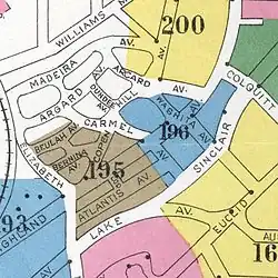 In 1888, the Copenhill Land Company was incorporated with Oscar Davis as president and Charles A. Davis as secretary and treasurer; Lodewick Johnson Hill was one of the three owners.[3] The company laid out the city's second "garden suburb" (after Inman Park). The centerpiece was Madeira Park, which, like Springvale Park in Inman Park, was created out of a natural ravine near the center of the development. Intersections of the curving streets were often defined by small circular or triangular parks similar to those found in Ansley Park today. Other open spaces were also included in the original design, most notably the small lake near the intersection of Layal (now Colquitt) Avenue and Highland Avenue, which was fed by a small branch that formed part of the headquarters of Clear Creek. The Copenhill developers cooperated with the Inman Park developers to insure both developments were finished to the greatest advantage of one another.[4]