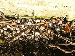 Like other Pulmonata, individuals are hermaphrodites, producing both male and female gametes. Reproduction is predominantly, and probably exclusively, by outcrossing.[30][31] During a mating session of several hours, two snails exchange sperm reciprocally. H. aspersa snails stab a calcite spine, known as a love dart, into their partner. The mucus coating the love dart contains a chemical that diverts sperm away from being digested. This is important for sperm competition because individuals mate repeatedly and the donated sperm can remain viable for 4 years.[31][32] About 10 days after fertilisation, the snail lays a batch of on average 50 spherical, pearly-white eggs into crevices in the topsoil, or sheltered under stones.[30] In a year it may lay approximately six batches of eggs.[33] The size of the egg is 3 mm.[30]