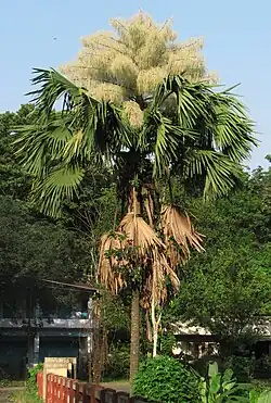 Corypha umbraculifera, the talipot palm, is a species of palm native to eastern and southern India and Sri Lanka. It is also grown in Cambodia, Myanmar, Thailand, Mauritius and the Andaman Islands.[3] It is one of the five accepted species in the genus Corypha.[4] It is a flowering plant with the largest inflorescence in the world. It lives up to 60 years before bearing flowers and fruits. It dies shortly after.