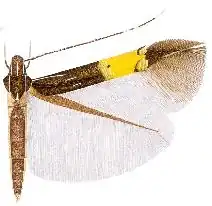 Male. Forewing length 4.1 mm. Head: frons shining pale ochreous-grey with greenish and reddish reflections, vertex and neck tufts shining dark bronze brown with greenish and reddish gloss, laterally and medially lined white, collar shining dark bronze brown with greenish and reddish gloss; labial palpus first segment very short, white, second segment three-quarters of the length of third, dark brown with white longitudinal lines laterally and ventrally, third segment white, lined brown laterally; scape dorsally dark brown with a white anterior line, ventrally white; antenna shining dark brown, with an interrupted white line from base to beyond one-half, followed towards apex by six dark brown segments, four white, two dark brown, two white, ten dark brown and seven white segments at apex. Thorax and tegulae shining dark bronze brown with reddish gloss, thorax medially with a short white posterior line, tegulae narrowly lined white inwardly. Legs: shining dark brown with reddish gloss, femora of midleg and hindleg shining ochreous-grey with golden reflection, foreleg with a white line on tibia and tarsal segments one, two, base of segment three and segment five, tibia of midleg with white oblique basal and medial lines and a white apical ring, midleg with tarsal segment one with white longitudinal line on outside from base to dorsum at apex, segment two with a white dorsal line in apical half, segments five dorsally white, tibia of hindleg as midleg, tarsal segments one and two with indistinct ochreous dorsal spots, segment three with white dorsal spot, segment four dorsally white and segment five entirely white, spurs dark brown with purplish gloss and with a longitudinal white streak. Forewing shining dark bronze brown with reddish gloss, three white lines in the basal area, a subcostal from base to one-quarter, bending from costa distally, a very short medial above fold, ending beyond apex of subcostal, a subdorsal, shorter than the medial and starting slightly further from base than the latter, a yellow transverse fascia beyond the middle with a very short apical protrusion, narrowed towards dorsum, bordered at the inner edge by a tubercular pale golden metallic fascia with greenish and purplish reflections, subcostally on the outside with a blackish spot, bordered at outer edge by two tubercular pale golden metallic costal and dorsal spots with greenish reflection, the dorsal spot about twice as large as the costal and more towards base, both spots irregularly lined dark brown on the inside, the costal spot outwardly edged by a narrow white costal streak, a shining blue apical line from the distal half of the apical area, shining white in the cilia, cilia dark brown, paler towards dorsum. Hindwing shining dark greyish brown with reddish gloss, cilia brown. Underside: forewing shining dark brown with greenish reflection, the white spot at apex distinctly visible, hindwing shining dark greyish brown. Abdomen dorsally brown, laterally shining pale grey with greenish reflection, ventrally dark greyish brown, segments broadly banded shining yellowish white posteriorly, in middle completely yellowish white, anal tuft pale brownish grey.[1]