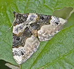 Their wingspan is between 20 and 29 mm and the length of their forewings is between 13 and 15 mm.[3] The ground colour of the forewings is creamy white to bright white. The base and midfield are coloured black to blue black. The latter is crossed by two bright lines. In the midfield band is a deep, jagged spot. In the bright areas between the basal area and the midfield as well as in the marginal field are grey or black spots of varying degrees. The hindwings are whitish and show a small black middle spot.[4][5][6][7]
