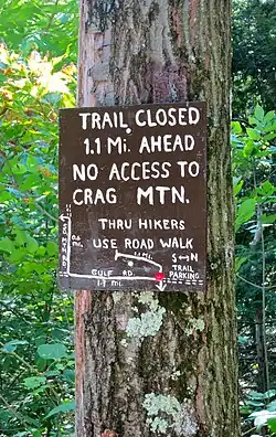 Currently (August 2018), the Crag Mountain summit is closed to thru hikers on the M & M Trail at the request of the landowner. The trail remains blazed with white blazes from Gulf Road in a southerly direction to within a half mile of the summit (marked with three USGS benchmarks). Orange blazes and a well-marked trail continue southerly to the open summit, which affords views of Mt. Monadnock, Mt. Wachusett, and what appears to be Stratton Mountain (VT) to the northwest.