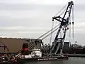 A Sheer-legs barge is a barge with sheer-legs mounted at one end, which can lift loads and luff the sheer-legs to adjust the reach, but cannot swing the load independently of the hull orientation. A typical arrangement has a substantial A-frame hinged at the stern, supported by stays to the bow. When the load has been lifted, the barge is maneuvered to the position where the load is to be lowered by onboard thrusters or tugs, and the load is lowered. A sheer-legs barge always keeps the load in the line of maximum static stability, and may use ballasting at the bow to increase longitudinal righting moment to compensate for the load. The sheer-legs arrangement is more economical to manufacture and maintain than a slewing crane, but may be less convenient as the whole vessel must be moved to precise position for lifting and lowering. It is usual to luff the sheer-legs before lifting to a position suitable for both lifting and setting the load, as luffing under load is generally slow, and there is seldom any need.[1]