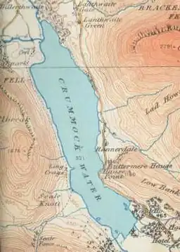 "The meaning of 'Crummock' seems to be 'Crooked one', from British" (Brythonic Celtic) "'crumbaco'-'crooked'".[2] This may refer to the winding course of the River Cocker, which flows out of the lake, or refer to the bending nature of the lake itself. It may also refer to the road that runs along the eastern side of the lake, which is extremely winding and 'crooked'. The word "'water' is the main Lakeland term for 'lake'".[2]