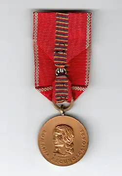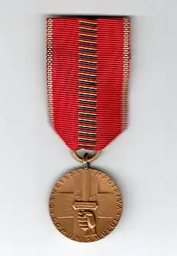 The Medalia Cruciada împotriva comunismului ("Crusade Against Communism medal", in reference to Operation Barbarossa) was a Romanian military award of World War II. It was instituted on April 1, 1942, by the Royal Decree No. 1014, of King Michael I of Romania.[1] It was commissioned to recognise the distinguished service of Romanian and other Axis Powers military and civilian personnel operating on both the Eastern and Home fronts.