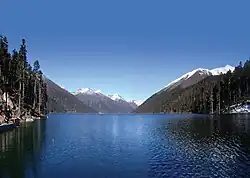 29°48′47″N 94°25′50″E / 29.813155685738057°N 94.43067662229751°E Cuomujiri Lake (Chinese: 措木及日湖, 错木及日, Tibetan: མཚོ་མོ་སྐྱིད་རི་མཚོ, Tso Mo Kyi Ri Tso), is situated near Bayi Town, Nyingchi, Tibet Autonomous Region. This alpine glacial lake spans 10 km² at 3,400 meters elevation. Fed by meltwater from the Nyenchen Tanglha Range, it features turquoise waters framed by vertical vegetation zones: rhododendron thickets (3,200–3,600m), fir forests (3,600–4,200m), and permanent snowlines above 4,500m.[1]