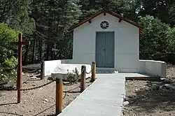 While some controversy surrounds the issue of what exactly happened to the writer's ashes after the cremation,[9] it generally is agreed that they were brought to New Mexico and then mixed with concrete to form part of the large memorial stone which was placed in a small covered building on the ranch site, now known as the Lawrence Memorial,[10] although the term "shrine" had been used in the past.[10]