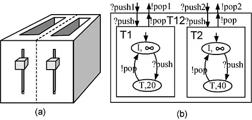 For example, the toaster models drawn in Fig. 3(b) are not SP-DEVS because the total state associated with "idle" (I), is passive but it moves to an active state, "toast" (T) whose toasting time is 20 seconds or 40 seconds. Actually, the model shown in Fig. 3(b) is FD-DEVS.