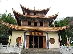 Daguan Park (simplified Chinese: 大观公园; traditional Chinese: 大觀公園; pinyin: Dàguān Gōngyuán) is a lakeside park located in the southwestern suburb of Kunming, Yunnan, China. Today many locals come to sit, drink tea, fly kites, and go boating. Among shady walks and pools, Daguan's focal point is Daguan Lou, a square, three-storeyed pavilion built to better the Kangxi Emperor's enjoyment of the distant Western Hills and now a storehouse of calligraphy extolling the area's charms. The most famous poem here is a 118-character verse, carved into the gateposts by the Qing dynasty scholar Sun Ran, reputed to be the longest set of rhyming couplets in China. The park is set on Daguan Stream, which flows south into Lake Dian, and there are frequent hour-long cruises down the waterway, lined with willows, to points along Lake Dian's northern shore. Lake Dian, also known as the Kunming Lake, is the largest lake on the Yunnan-Guizhou Plateau. At Longmen of the Western Hills, there is a panoramic view of the lake.