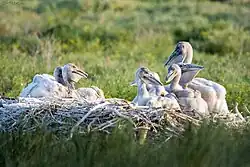 The nest is a moderately-sized pile of grass, reeds, sticks, and feathers, usually measuring about 1 m (3.3 ft) deep and 63 cm (25 in) across. Nests are usually located on or near the ground, often being placed on dense floating vegetation. Nests tend to be flimsy until cemented together by droppings. Breeding commences in March or April, about a month before the great white pelican breeds. The Dalmatian pelican lays a clutch of one to six eggs, with two eggs being the norm. Eggs weigh between 120 and 195 g (4.2 and 6.9 oz).[54] Incubation, which is split between both parents, lasts for 30 to 34 days. The chicks are born naked but soon sprout white down feathers. Aggressive behaviour between siblings is very rare and generally non-fatal. When the young are 6 to 7 weeks of age, the pelicans frequently gather in "pods". The offspring fledge at around 85 days and become independent at 100 to 105 days old. Nesting success relies on local environmental conditions, with anywhere from 58% to 100% of hatchlings successfully surviving to adulthood. Sexual maturity is thought to be obtained at three or four years of age.[34][55]