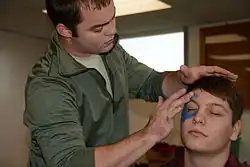 Senior Airman Greg Meyer applies makeup to a Delaware cadet in preparation for a mass casualty exercise.