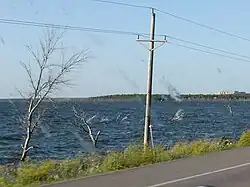 The low, flat terrain around Devils Lake consists of various coulees, channels, and basins, which may be separated during times of low water, or connected during high water.[11] Thus the boundaries of the lake can vary greatly from year to year, depending on the amount of precipitation.