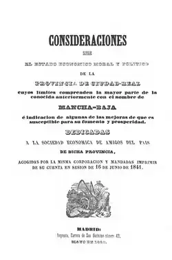 An enlightened and industrious corporation, peaceful and averse to harmful parties, harmless in every way, without means or faculties for harm, and with a vast field in which to deploy its beneficial influence, cannot be the target of envy or base flattery, but solely and exclusively of veneration and the most sincere affection. To promote the development of material interests with activity and skill, such is the distinctive character of an Economic Society. Encouraged by these or similar reflections and motivated by the burning desire to contribute to the well-being as much as I am able, I dare to present to this worthy Society the following: Considerations on the economic, moral, and political state of the province of Ciudad Real, and indication of some of the improvements it is susceptible to for its development and prosperity.[12]