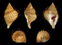 Five views of a shell of Distorsio muehlhaeusseri with its periostracum intact