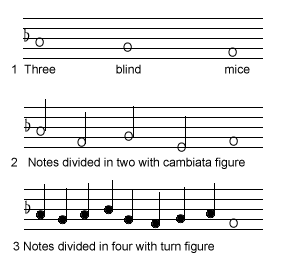 In music, division (also called diminution or coloration) refers to a type of ornamentation or variation common in 16th- and 17th-century music[1] in which each note of a melodic line is "divided" into several shorter, faster-moving notes, often by a rhythmic repetition of a simple musical device such as the trill, turn or cambiata on each note in turn, or by the introduction of nonchord tones or arpeggio figures. The English term 'division' broadly corresponds to the contemporary usage of passaggio in Italian, diferencia or glosa in Spanish, and double in French.[2][3]