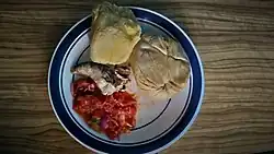 Unlike ugali, making kenkey involves letting the maize ferment before cooking. Therefore, preparation takes a few days in order to let the dough ferment. Corn meal is mixed with cornstarch and water is added until a smooth and consistent dough is obtained. It is covered and left in a warm place for the fermentation to take place.[2] After fermentation, the kenkey is partially cooked, wrapped in banana leaves, corn husks, or foil, and steamed.[4] There are several versions of kenkey, such as Ga and Fante kenkey. The Ga kenkey is more common in most parts of Ghana.