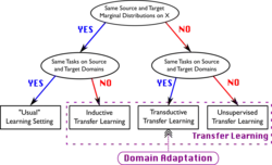 Domain adaptation is a specialized area within transfer learning. In domain adaptation, the source and target domains share the same feature space but differ in their data distributions. In contrast, transfer learning encompasses broader scenarios, including cases where the target domain's feature space differs from that of the source domain(s).[2]