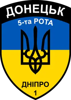 In April 2014, its establishment started in the form of Donetsk Battalion[1] In the end, instead of a battalion, the 5th Donetsk Company was established as a part of the Dnipro-1 Regiment with Lieutenant Colonel Volodymyr Shilov being appointed its commander.[2] Since April 2014, the company engaged separatists in Donetsk Oblast.[3][4] From 23 to 26 May 2014, the company carried out security and guardian operations during the 2014 Ukrainian presidential election in Pokrovsk Raion.[5] On 10 July 2014, the Company conducted combat reconnaissance near the village of Karlivka and evacuated the dead and wounded soldiers of the 93rd Mechanized Brigade under intense fire from the separatists and returned to the company base without casualties.[6] On 21 July 2014, together with the Dnipro-2 Battalion, the Donbas Battalion and the 93rd Mechanized Brigade, the company captured the villages of Tonenke, Vodiane and Pisky. During the Battle of Pisky, the company captured a separatist Daewoo Lanos carrying four members of the "Russian Orthodox Army" who were also captured. 12 RGD-5 grenades, 8 AK-47s and 25 kg of explosives were captured. On 25 July 2014, along with the Dnipro-2 Battalion, the Shakhtarsk Battalion and the 93rd Mechanized Brigade, Pisky was captured. Following the panic retreat of the two battalions and their armored vehicles, the company took up the defense of the village, the company did not suffer casualties but separatist Berkut unit was destroyed, 4 separatists traveling in a "Gazelle" car. A Utes machine gun, a PKM machine gun, 2 AK-74s, 10 F-1 grenades were also captured. During reconnaissance operations, two separate policemen were captured, 2 AK-74s, a Mitsubishi Lancer police car of Donetsk People's Republic and 25 PM service. At the time of returning to combat positions in the Pisky, the company ran into a convoy of DPR separatists. During the battle, 12 separatists were killed, a Bogdan bus and a ZIL-131 were destroyed. Moreover, 1 SVD , 8 AK-74s, 4 PM pistols, 10 RGD-5s, 4 F-1 grenades were also captured. On 14 August 2014, during a reconnaissance operation, the company was ambushed wounding the company commander along with five other personnel who were then taken to Dnipropetrovsk.[7][8] On 14 September 2014, three personnel of the company were killed and several more wounded in a battle near Karlovka.[9] The company also operated in Novoazovsk and manned checkpoints there before its capture by Russian forces using tanks after which the personnel were relocated to Mariupol.[10] In November 2014, the company was operating near the city of Donetsk.[11]