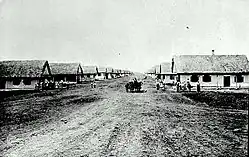 In accordance with the Dominion Lands Act of 1872, for a nominal fee of CA$10, the Canadian government would grant 160 acres (0.65 km2) of land to any male homesteader who was able to establish a working farm on that land within three years. Single-family homesteads would not fit the Doukhobors' communitarian tradition but a "Hamlet Clause" within the Act had been adopted 15 years earlier to accommodate other communitarian groups such as Mennonites. The clause allowed beneficiaries of the Act to live in a hamlet within 3 miles (4.8 km) from their land rather than on the land itself.[37] This allowed the Doukhobors to establish a communal lifestyle similar to that of the Hutterites. Also, by passing Section 21 of the Dominion Military Act in late 1898, the Canadian Government exempted the Doukhobors from military service.[37]