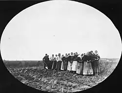 Verigin persuaded his followers to free their animals, and pull their wagons and plows themselves. On the lands granted to them in the prairies, the settlers established Russian-style villages, some of which received Russian names after settlers' home villages in Transcaucasia; for example Spasovka, Large and Small Gorelovka, and Slavianka; while others gained more abstract "spiritual" names not common in Russia, such as Uspeniye (Dormition), Terpeniye (Patience), Bogomdannoye (Given by God), and Osvobozhdeniye (Liberation).[38] The settlers found Saskatchewan winters much harsher than those in Transcaucasia, and expressed disappointment the climate was not as suitable for growing fruits and vegetables. Women greatly outnumbered the men; many women worked on the farms tilling the land while many men took non-farm jobs, especially in railway construction.[37] The earliest arrivals came from three backgrounds, had varying commitments to communal life, and lacked leadership. Verigin arrived in December 1902, was recognized as the leader, and reimposed communalism and self-sufficiency. The railway arrived in 1904 and hopes of isolation from Canadian society ended.[39][40]