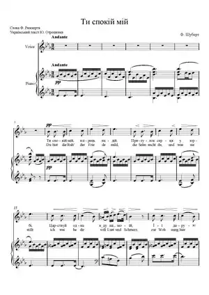 The piece has five stanzas. The first and second verses are almost exactly identical to the third and fourth, with the exception of one note. The fifth (and final) verse is the start of the B section ("Dies Augenzelt, von deinem Glanz allein erhellt, o füll es ganz!"). Both the piano and the voice have a marking of pianissimo up until measure 57, when there is finally a crescendo. This is in the first few bars of the B section. In measure 59, Schubert marks forte. Here is the climax as well as the highest note of the piece along with a decrescendo.[4] There is then a bar of rest and Schubert marks the next entrance at pianissimo once again. Perhaps this is to reinforce the mood of the song. "What could be more restful than silence?"[5] Schubert repeats this text, thereby creating a sixth verse. He then ends the vocal line on the dominant (B-flat), which leaves the piano to resolve the harmony. Throughout the piece, Schubert sets words like "joy" on the tonic, and words like "pain" on the dominant harmonies.[4]
