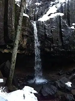 Hedge Creek Falls is a waterfall on Hedge Creek, in the Shasta Cascade area in Dunsmuir, California. There is a small cave located behind the waterfall, allowing visitors to walk behind the cascading water.[11] Shortly after the waterfall, Hedge Creek flows into the Sacramento River south of Mossbrae Falls. There is a viewing platform over the river, with a view of Mount Shasta. Access to the waterfall and viewing platform is via a short hiking trail. The trail starts at a small park off the Dunsmuir Ave/Siskiyou Ave exit on Interstate 5.[12] The close proximity to Interstate 5 makes the waterfall a very popular stopping point for passing motorists. Charles E. Bolton, better known as Black Bart, robbed the Roseburg, Oregon to Redding, California stage near Dunsmuir on October 25, 1879. Evidence found at the time indicated that Bart hid in the shallow cave behind the falls prior to the holdup. This was one of three holdups committed by Black Bart in this area. Normally he operated much further south.