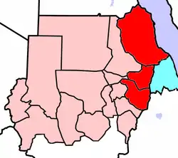 The Eastern Front (Arabic: الجبهة الشرقية, romanizedal-Jabhah al-Sharqīyah) was a coalition of rebel groups operating in eastern Sudan along the border with Eritrea, particularly the states of Red Sea and Kassala. The Eastern Front's Chairman is Musa Mohamed Ahmed. While the Sudan People's Liberation Army (SPLA) was the primary member of the Eastern Front, the SPLA was obliged to leave by the January 2005 Comprehensive Peace Agreement that ended the Second Sudanese Civil War. Their place was taken in February 2004 after the merger of the larger Beja Congress with the smaller Rashaida Free Lions, two tribal based groups of the Beja and Rashaida people, respectively.[1] The Justice and Equality Movement (JEM), a rebel group from Darfur in the west, then joined.