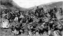 The initial success of the Romanian Army in Austro-Hungarian territory was quickly thrown into reverse by the Central Powers. German and Austro-Hungarian troops advanced from the north, while Bulgarian-Turkish-German forces marched into Romania from the south. Although thought to be a tactical blunder by contemporaries, the Romanians opted to mount operations in both directions instead of concentrating their forces.[78] By the middle of November, German forces had passed through the Carpathians, suffering significant casualties facing stiff Romanian resistance. By 5 December, Bulgarian troops had crossed the Danube and were approaching the capital, Bucharest. At the same time as the Austro-Hungarian troops moved east, and as the Bulgarians marched north, the Turks had sent in two army divisions by sea to the Dobruja from the east. Romania now faced annihilation from three sides.[79] The remaining Romanian forces were pushed back beyond the Siret in northern Moldavia. Romania received little direct help from the Allies despite previous assurances, with the French only dispatching a military mission of a thousand officers, health and support staff.