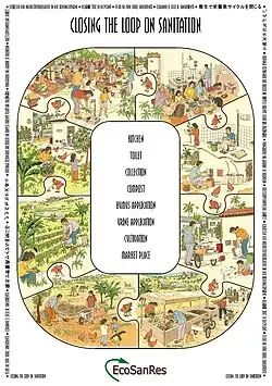 Ecological sanitation, commonly abbreviated as ecosan (also spelled eco-san or EcoSan), is an approach to sanitation provision which aims to safely reuse excreta in agriculture.[1] It is an approach, rather than a technology or a device which is characterized by a desire to "close the loop", mainly for the nutrients and organic matter between sanitation and agriculture in a safe manner. One of the aims is to minimise the use of non-renewable resources. When properly designed and operated, ecosan systems provide a hygienically safe system to convert human excreta into nutrients to be returned to the soil, and water to be returned to the land. Ecosan is also called resource-oriented sanitation.