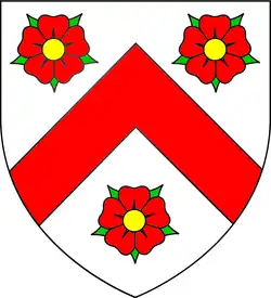 Arms of Phelips: Argent, a chevron gules between three roses of the second seeded or barbed vert